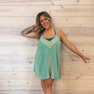 100% Cotton Woven Waffle Patchwork V-Neck Crisscross Back Mini Dress