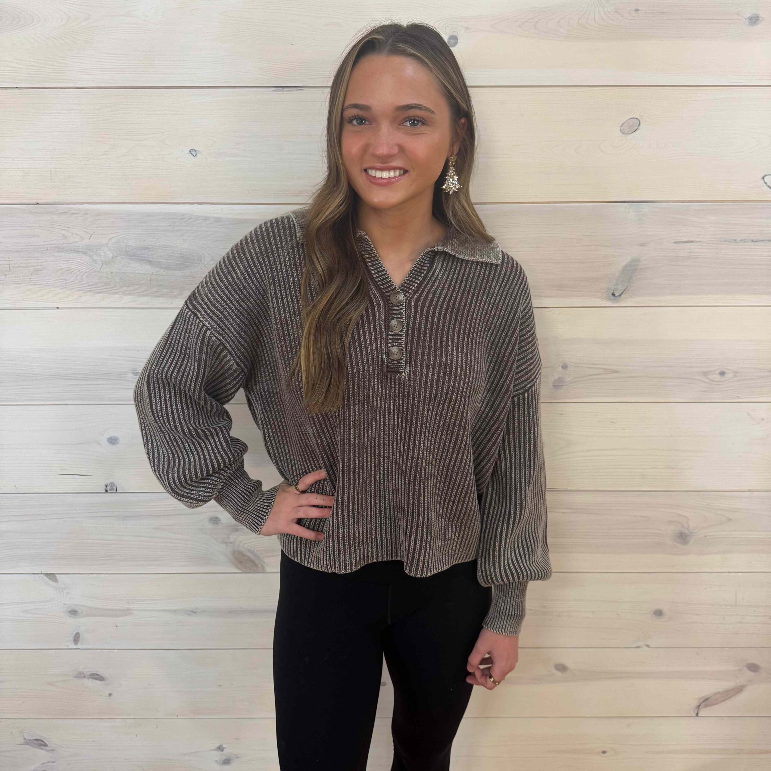 100% Cotton Washed Collared Henley Ribbed Heavyweight Long Sleeve Sweater
