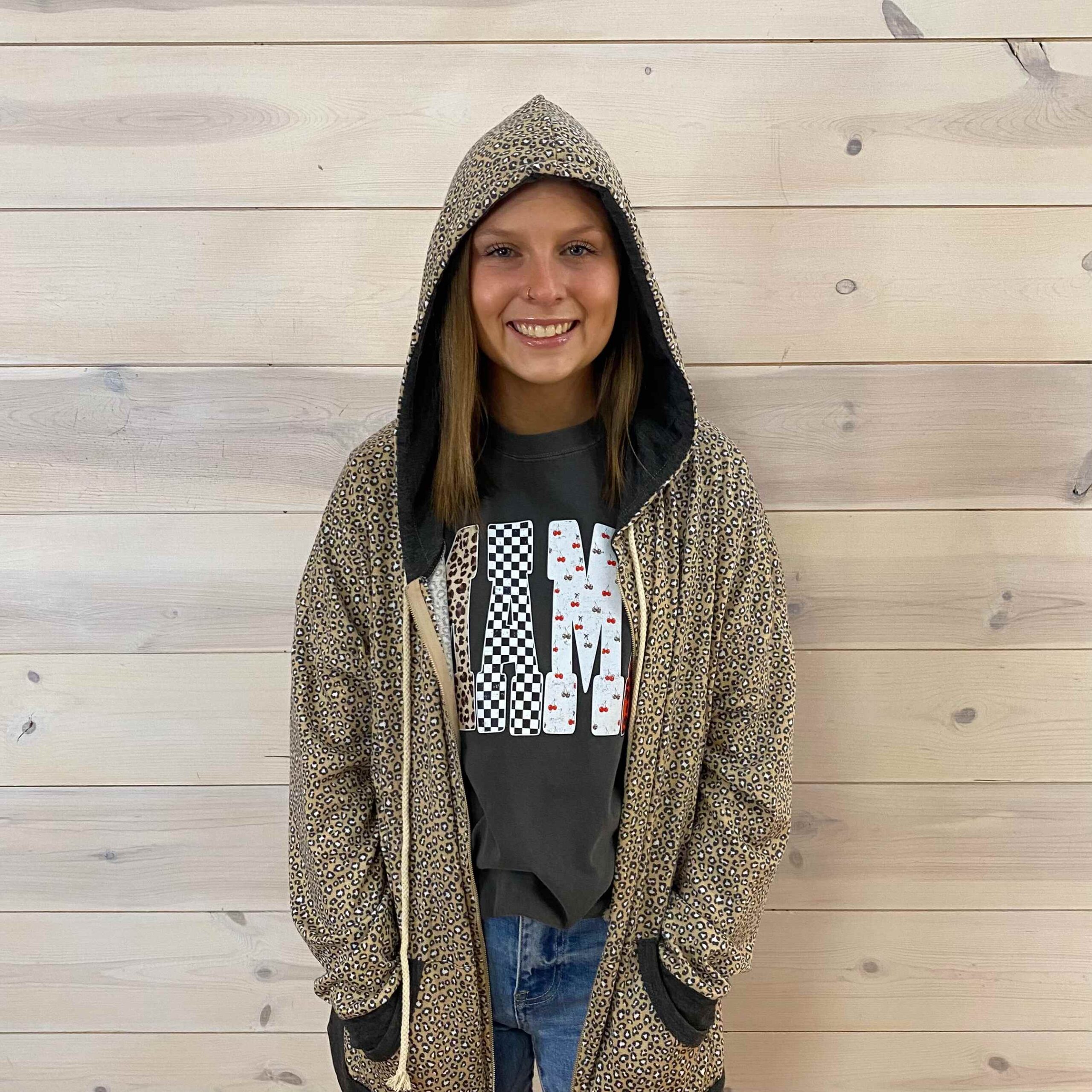 Animal Print Zip Up Drawstring Hoodie With Pockets