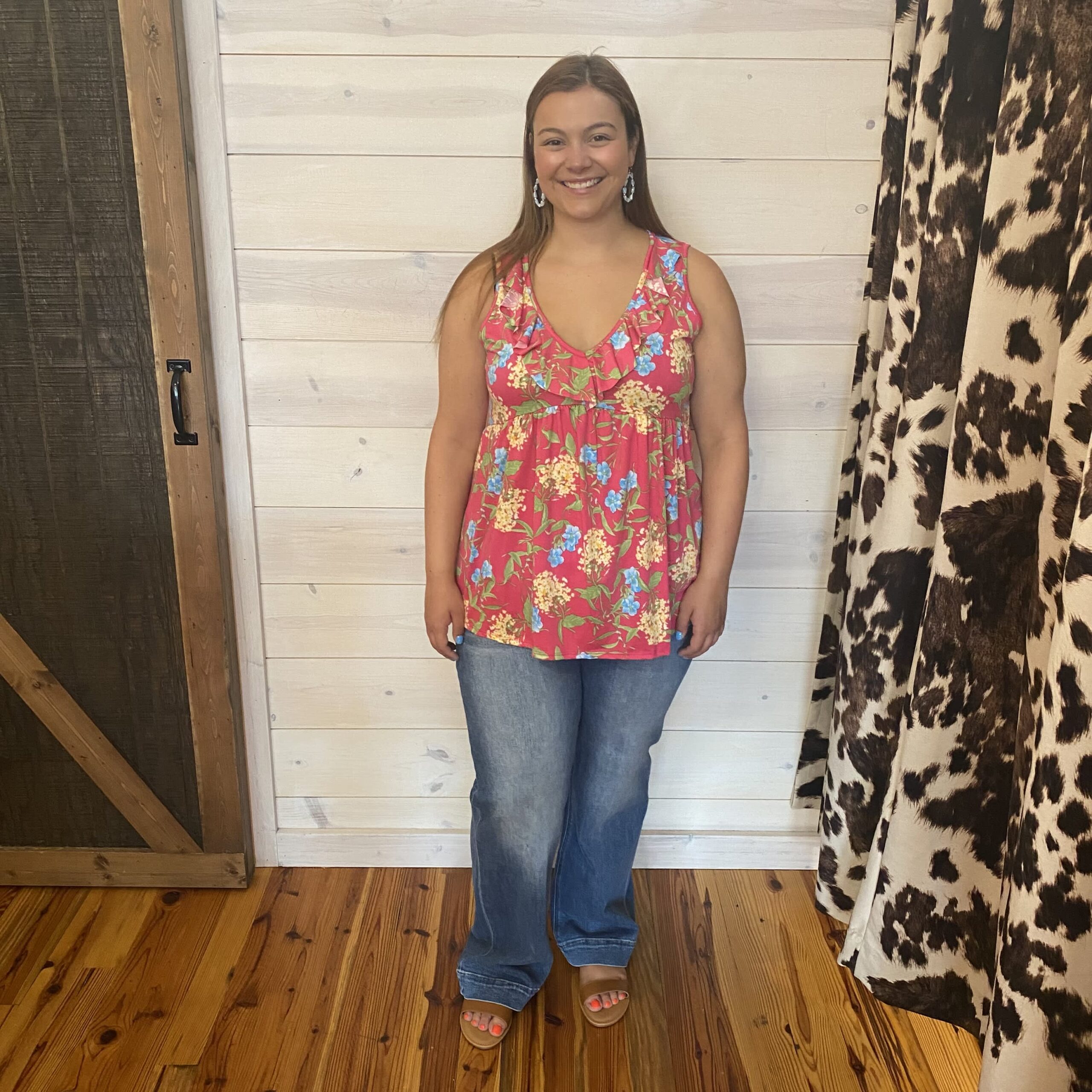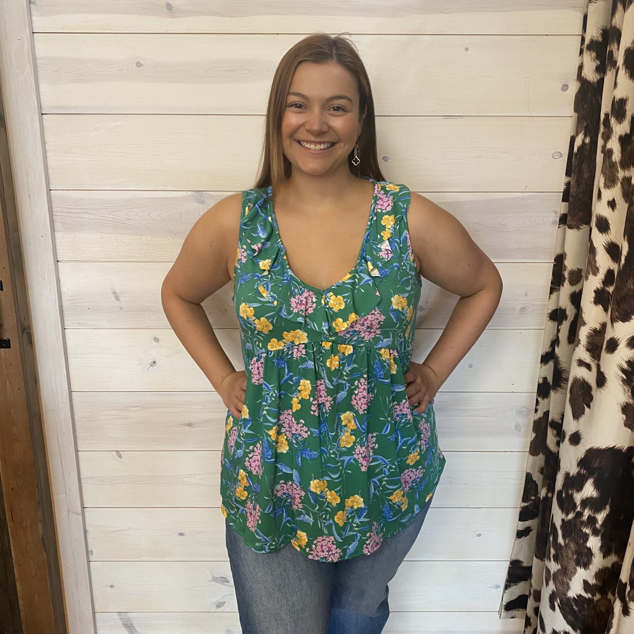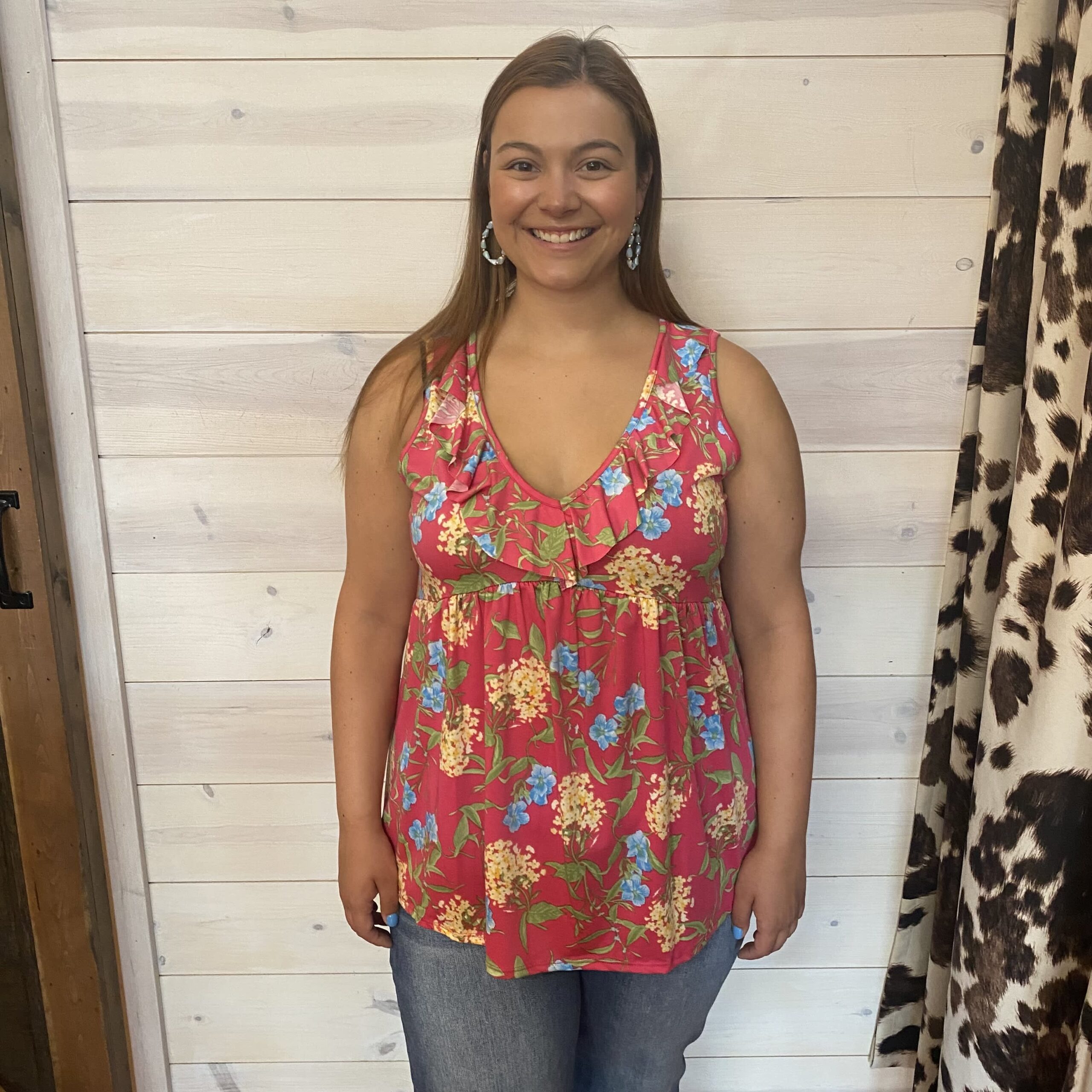 Floral Print V Neck Ruffle Babydoll Peplum Sleeveless Knit Top