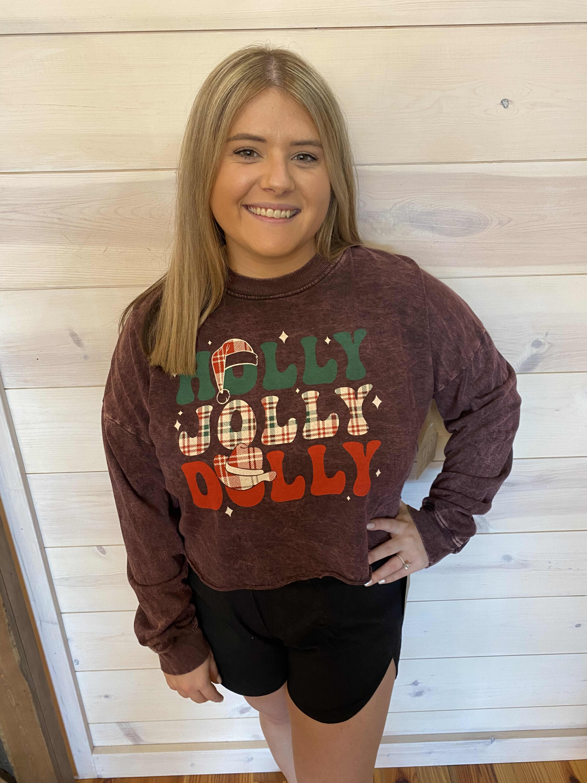 Holly Jolly Dolly Long Sleeve Cropped Graphic Top