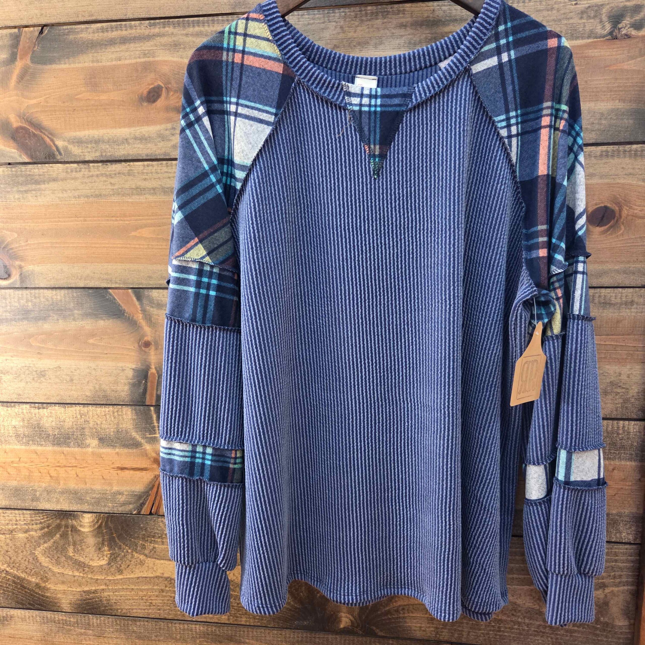 Mixed Media Plaid Patchwork Ribbed Pullover Top