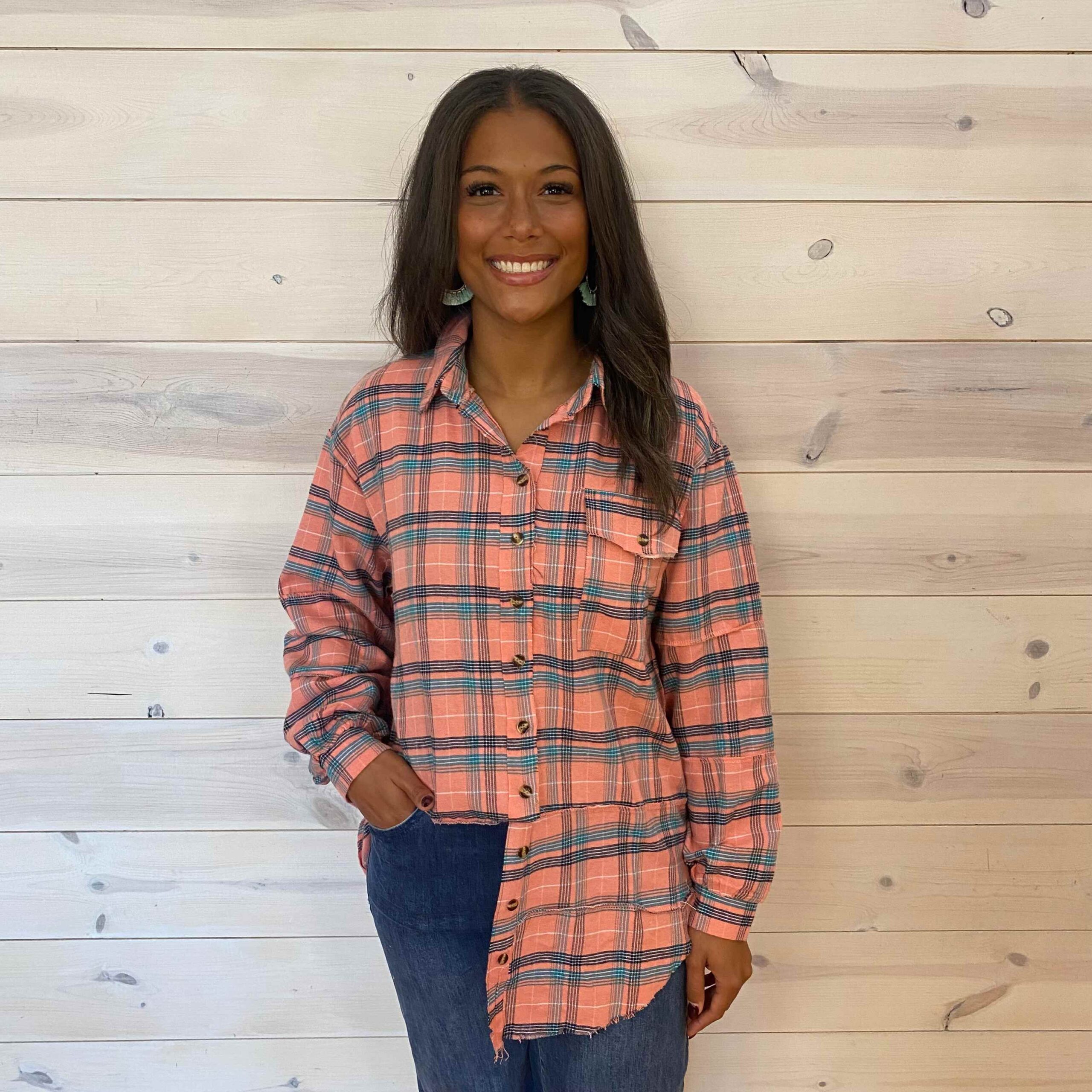 Plaid Oversized Long High Low Hem Shacket With Exposed Seams And Front Pockets