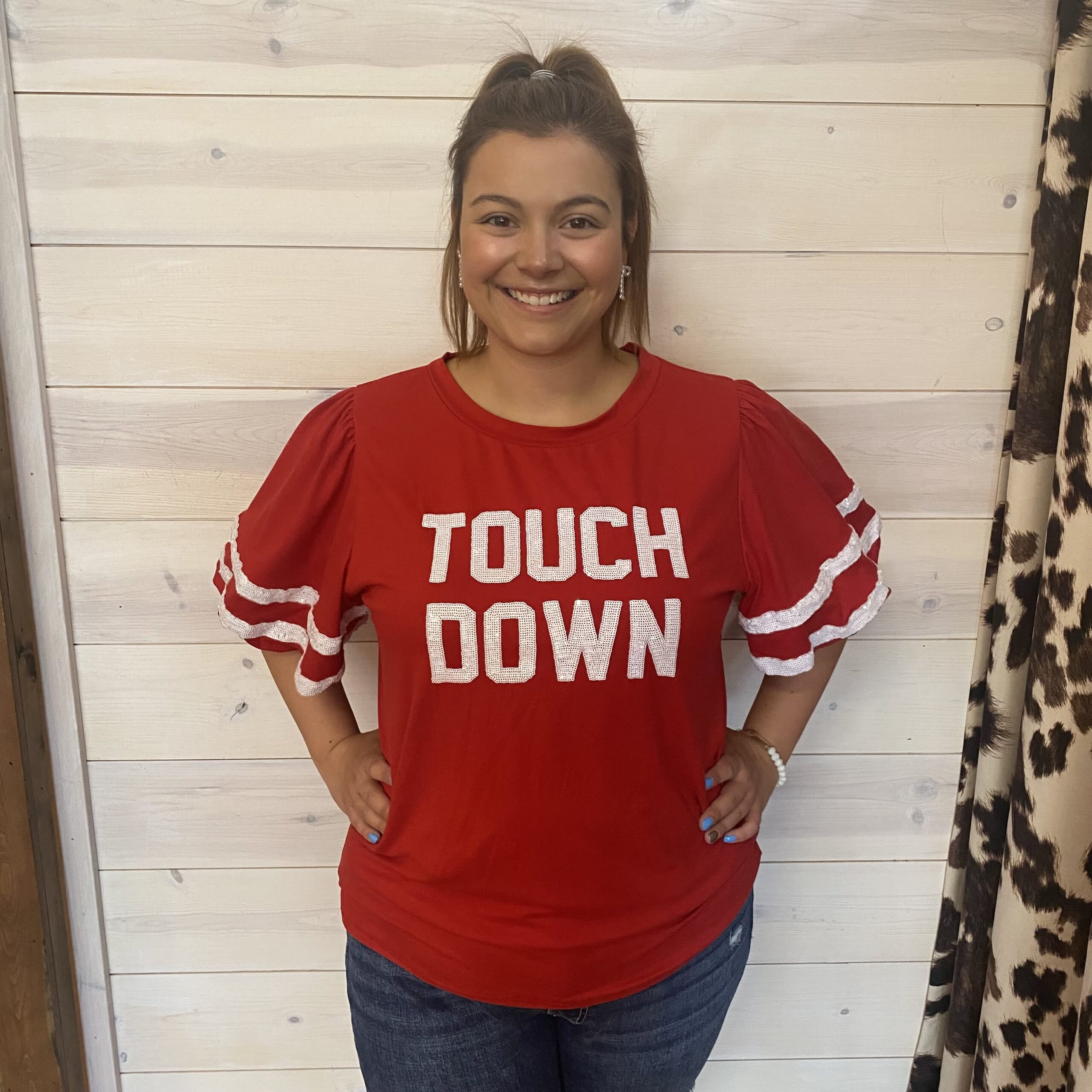 Round Neck Bubble Short Sleeve with Sequins Tape Touchdown Embroidery Sequins