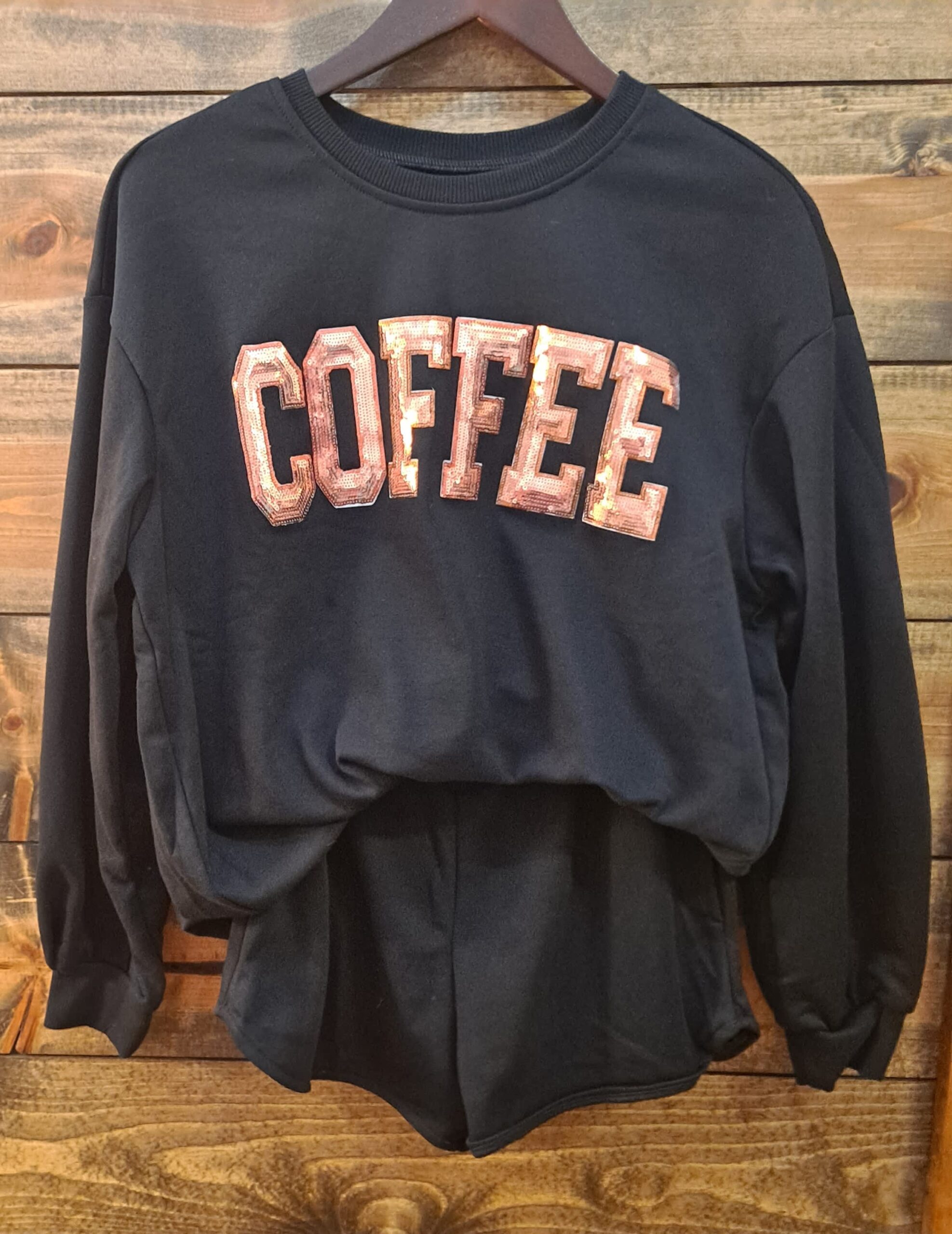 Sequined COFFEE Loose Fit Sweatshirt and Shorts Set with Pockets