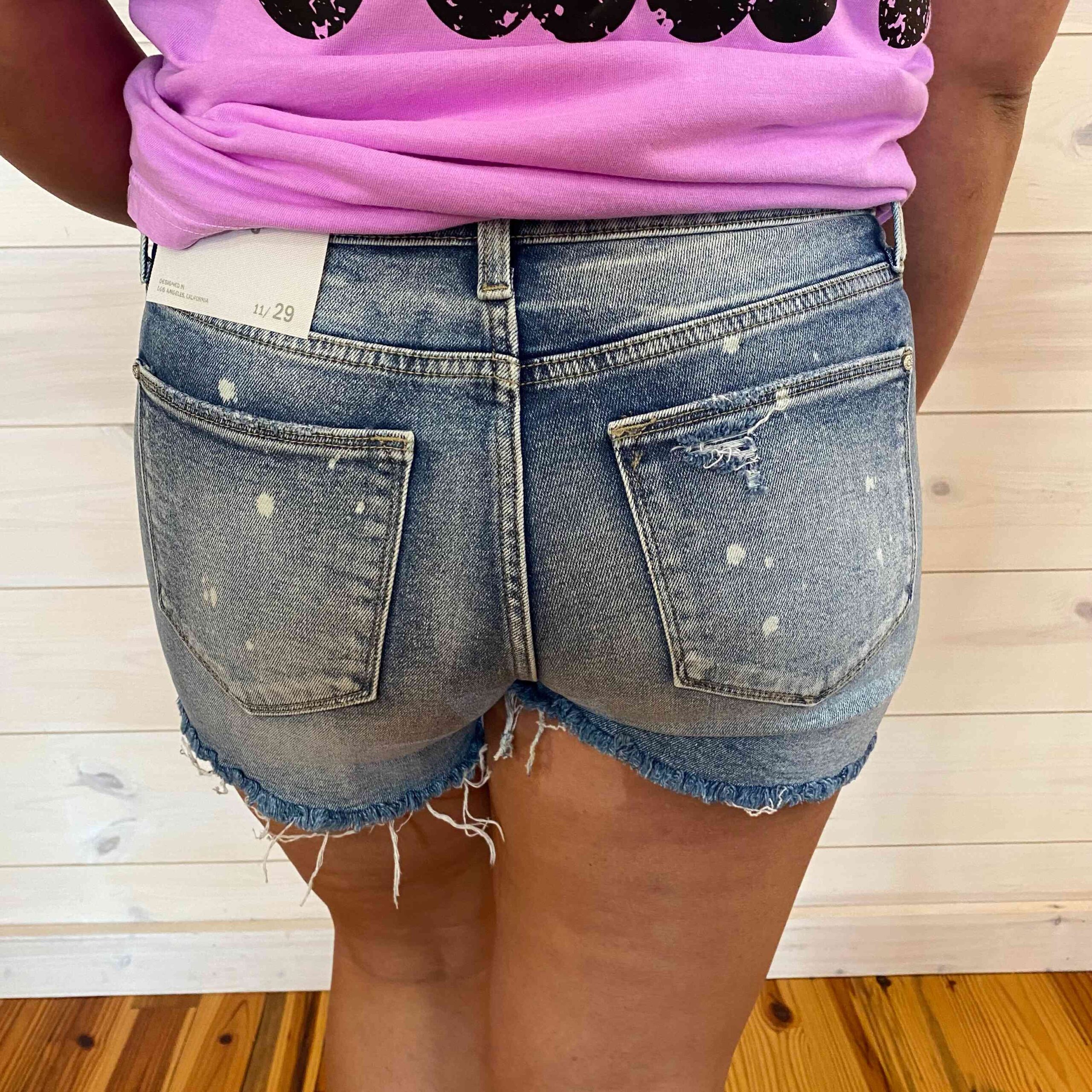 Sheila-High Rise Bleached Splattered Distressed Shorts with Frayed Hem