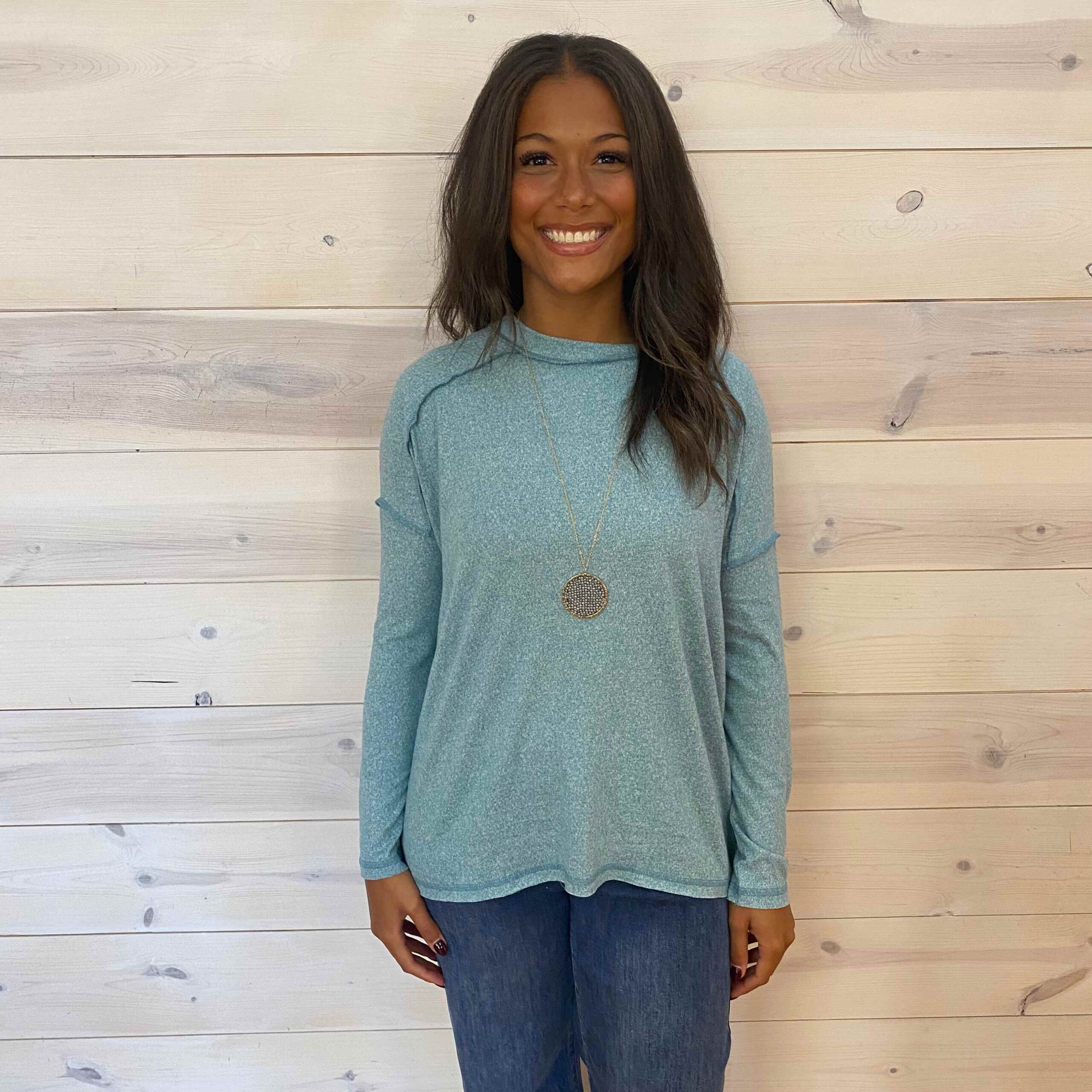 Soft Melange Hacci Exposed Seam Hi-Low Long Sleeve Top