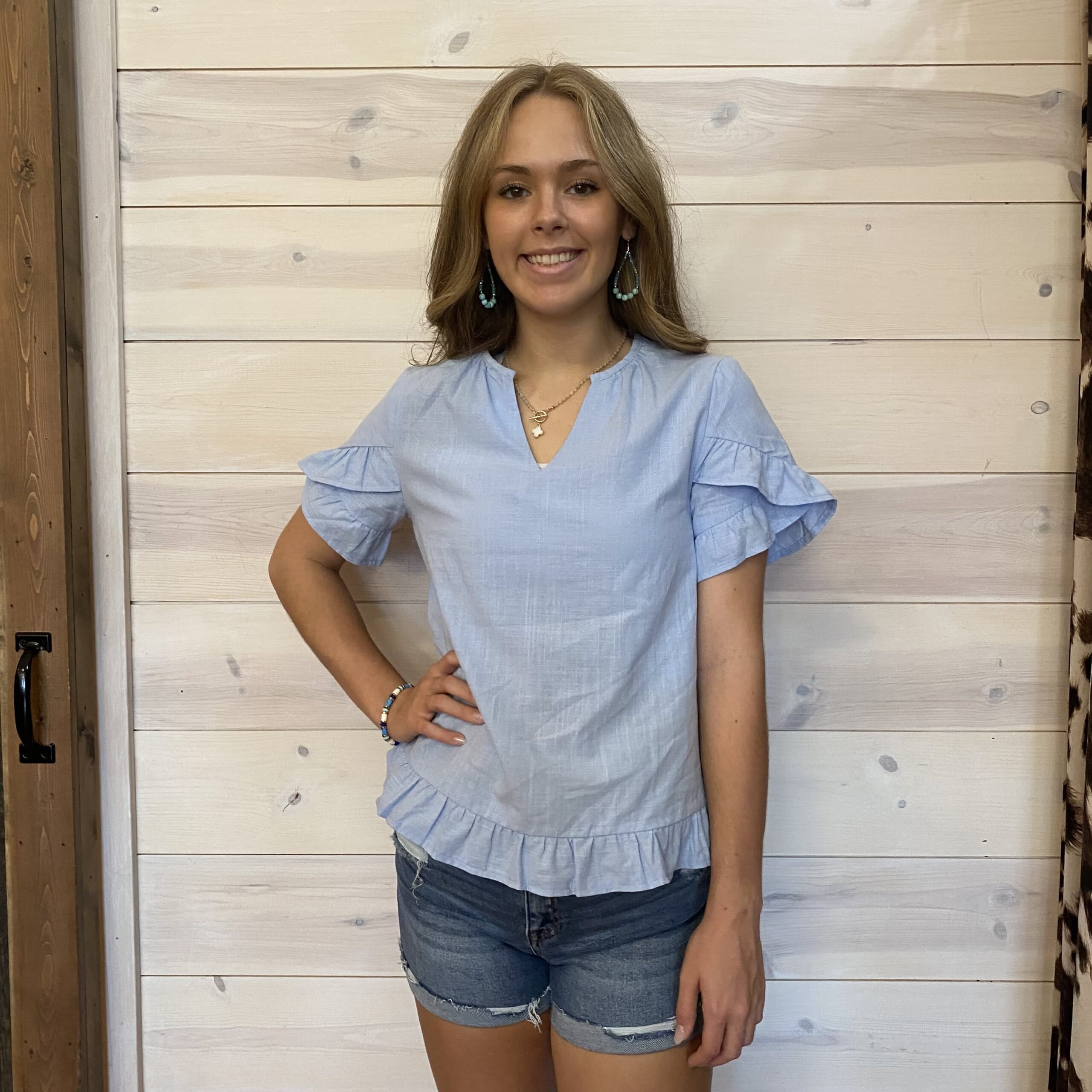 Solid V Neck Ruffle Hem Loose Fit Blouse
