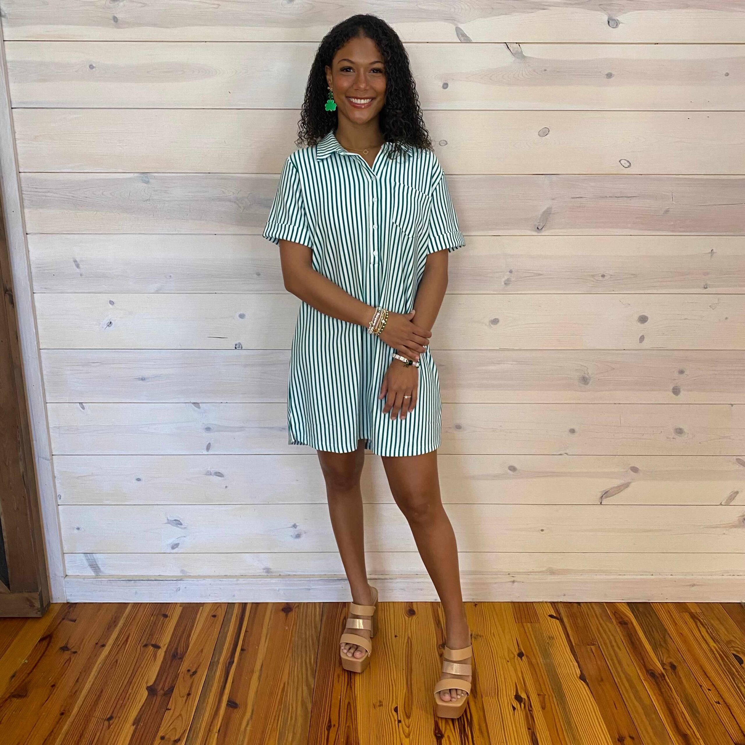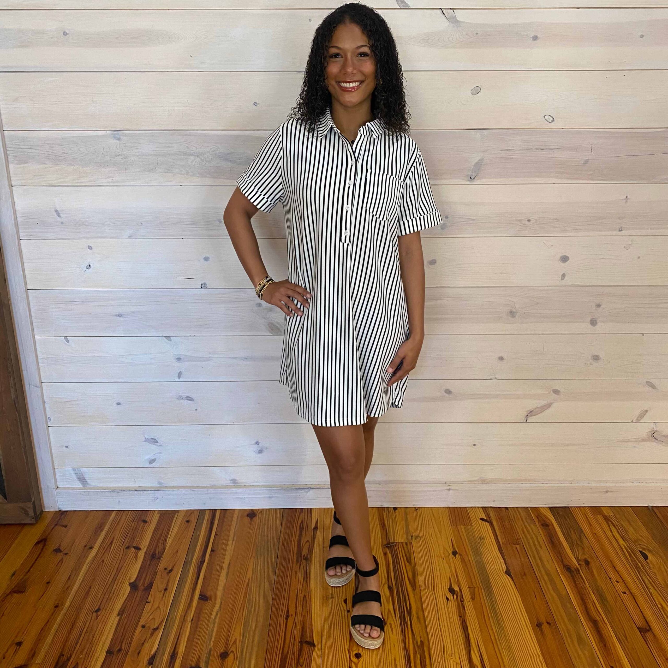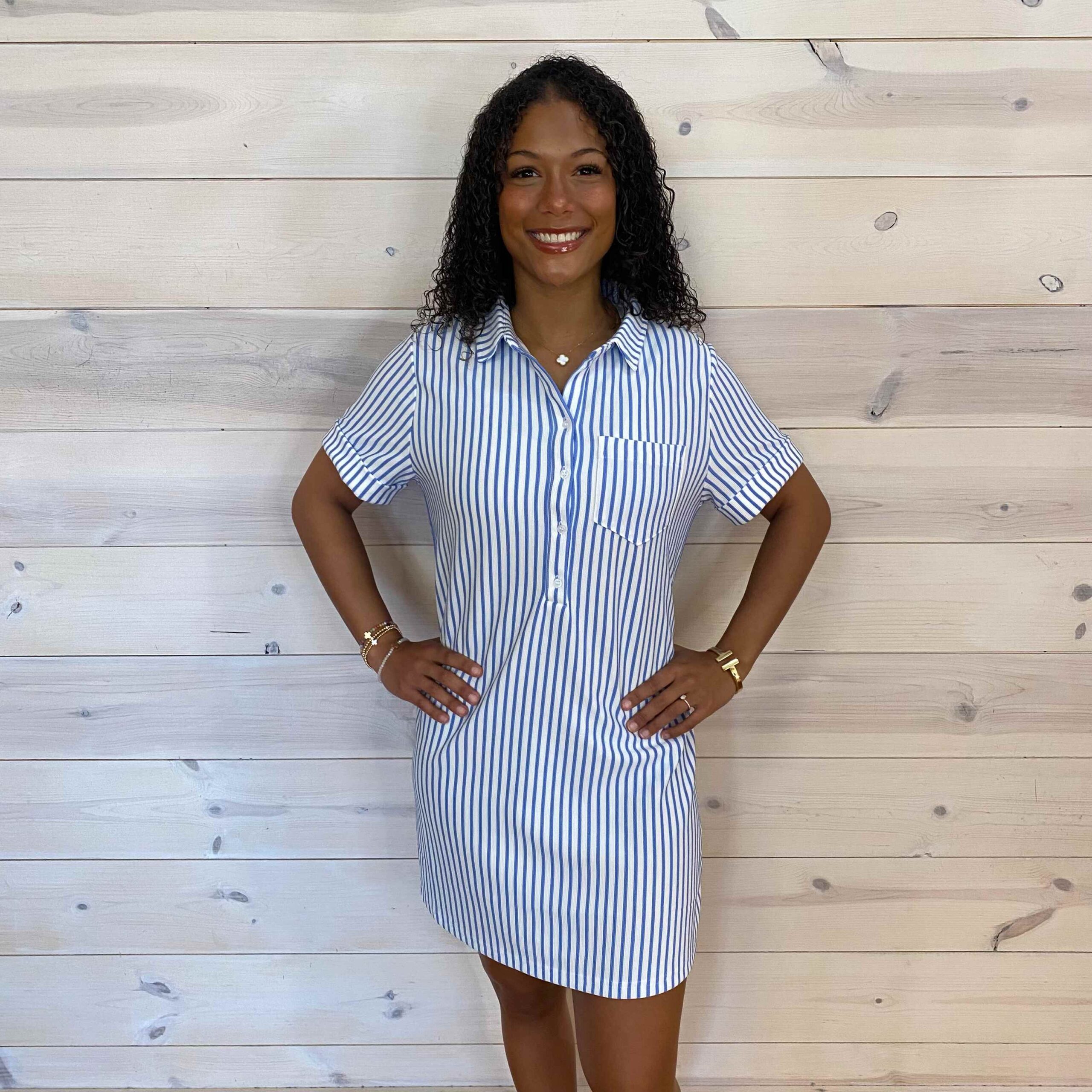 Stripe Collared Half Button Up T-shirt Dress With Front Pocket