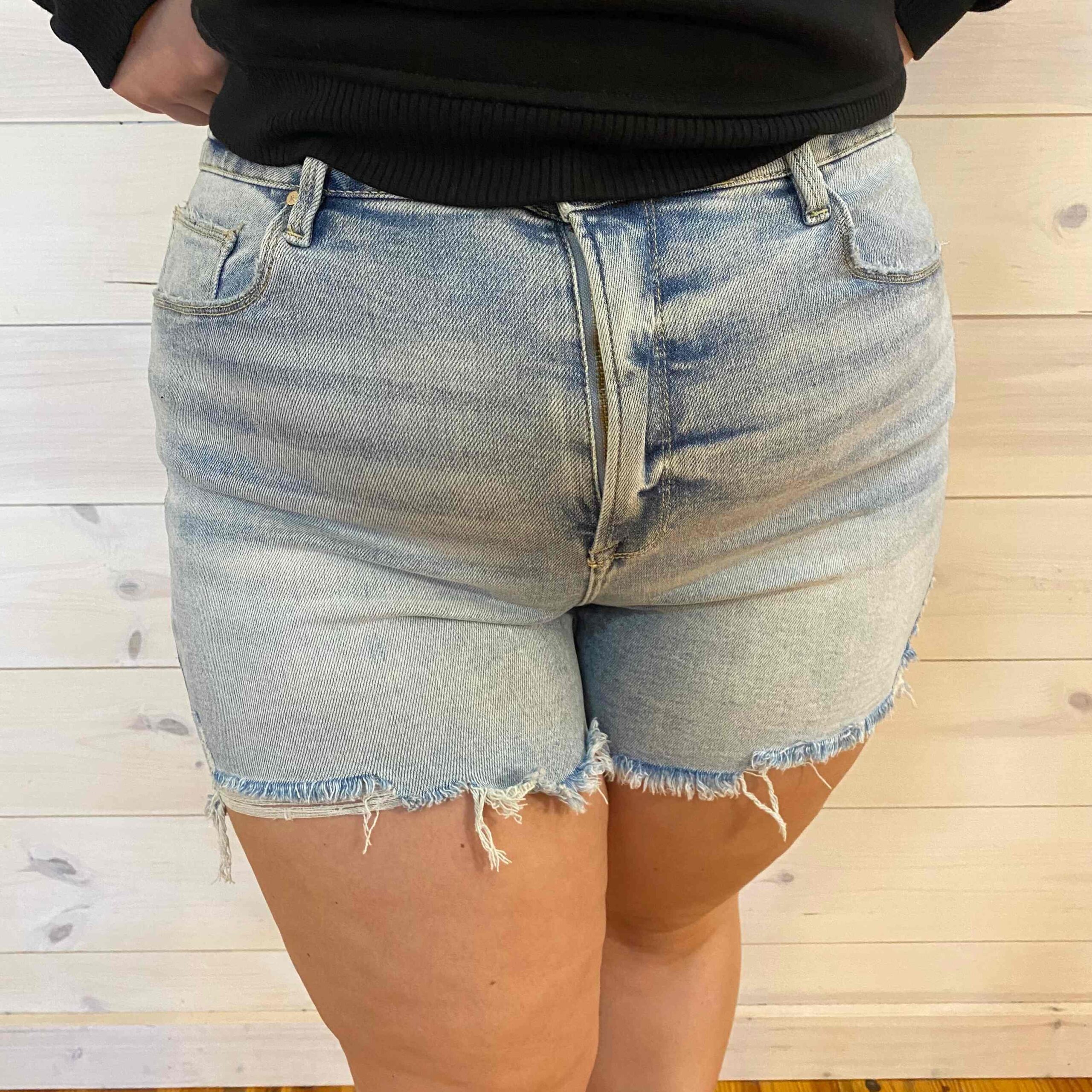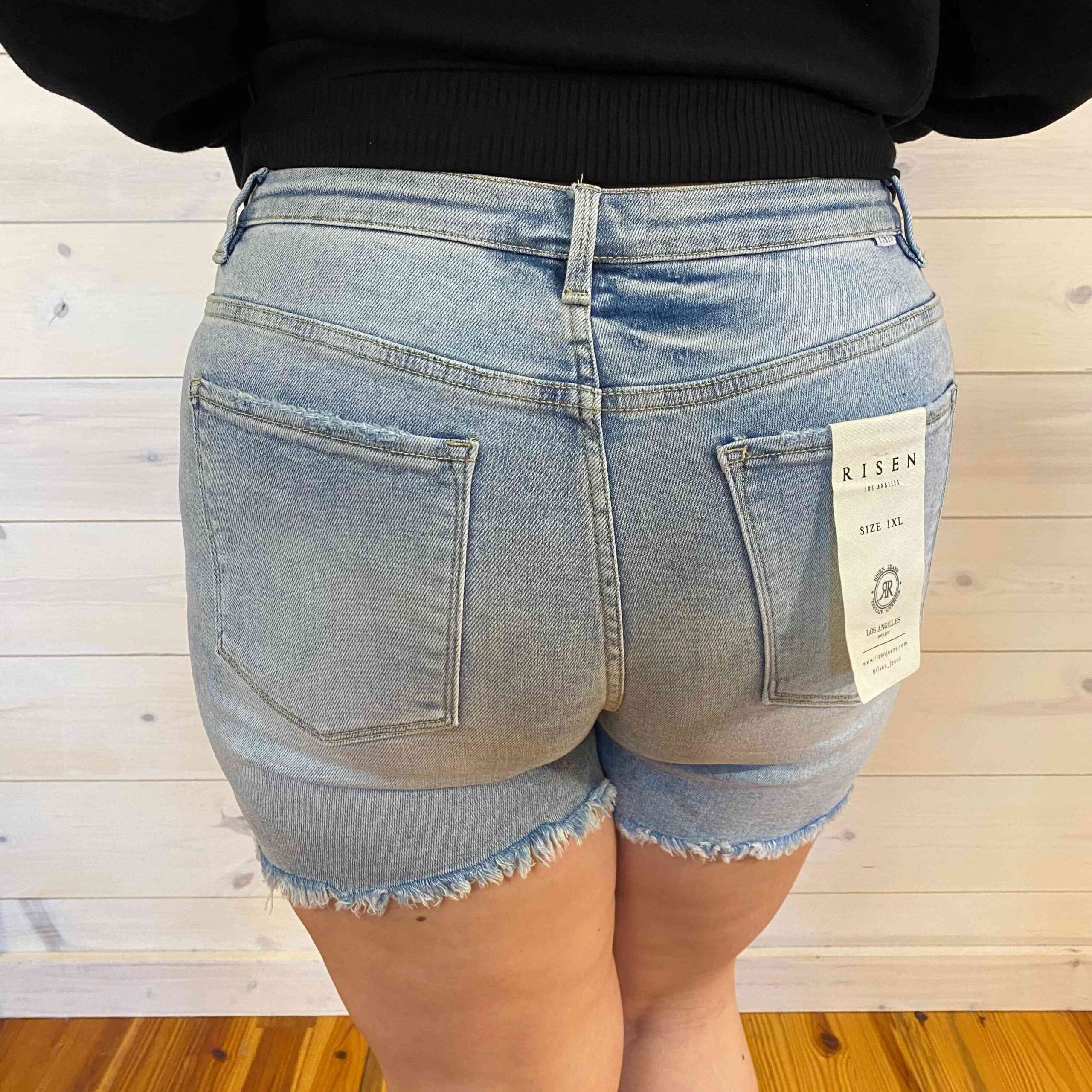 Montana-High Rise Stretch Dark Patched Work Shorts with Frayed Hem