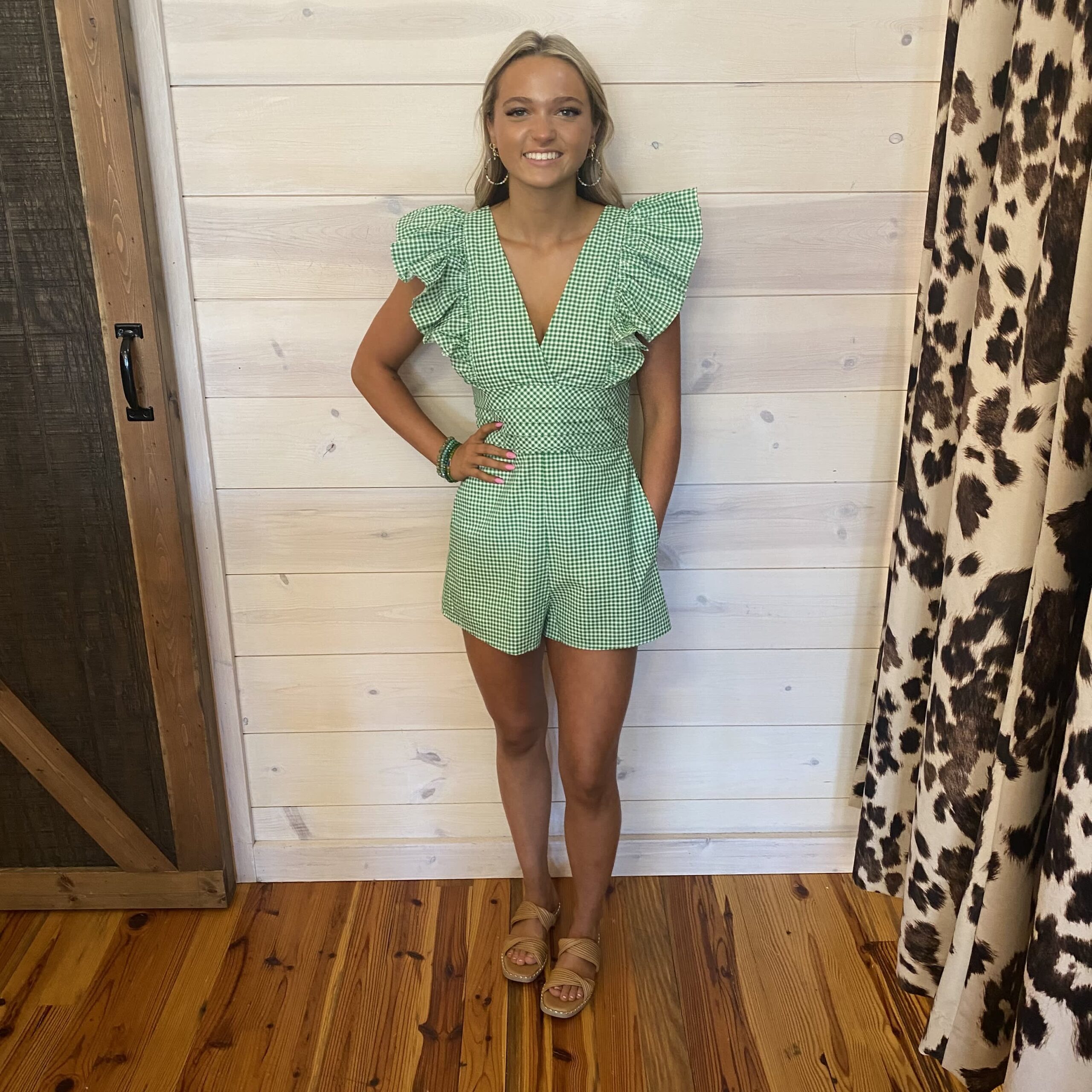 V-Neck Gingham Romper with Ruffle Sleeves