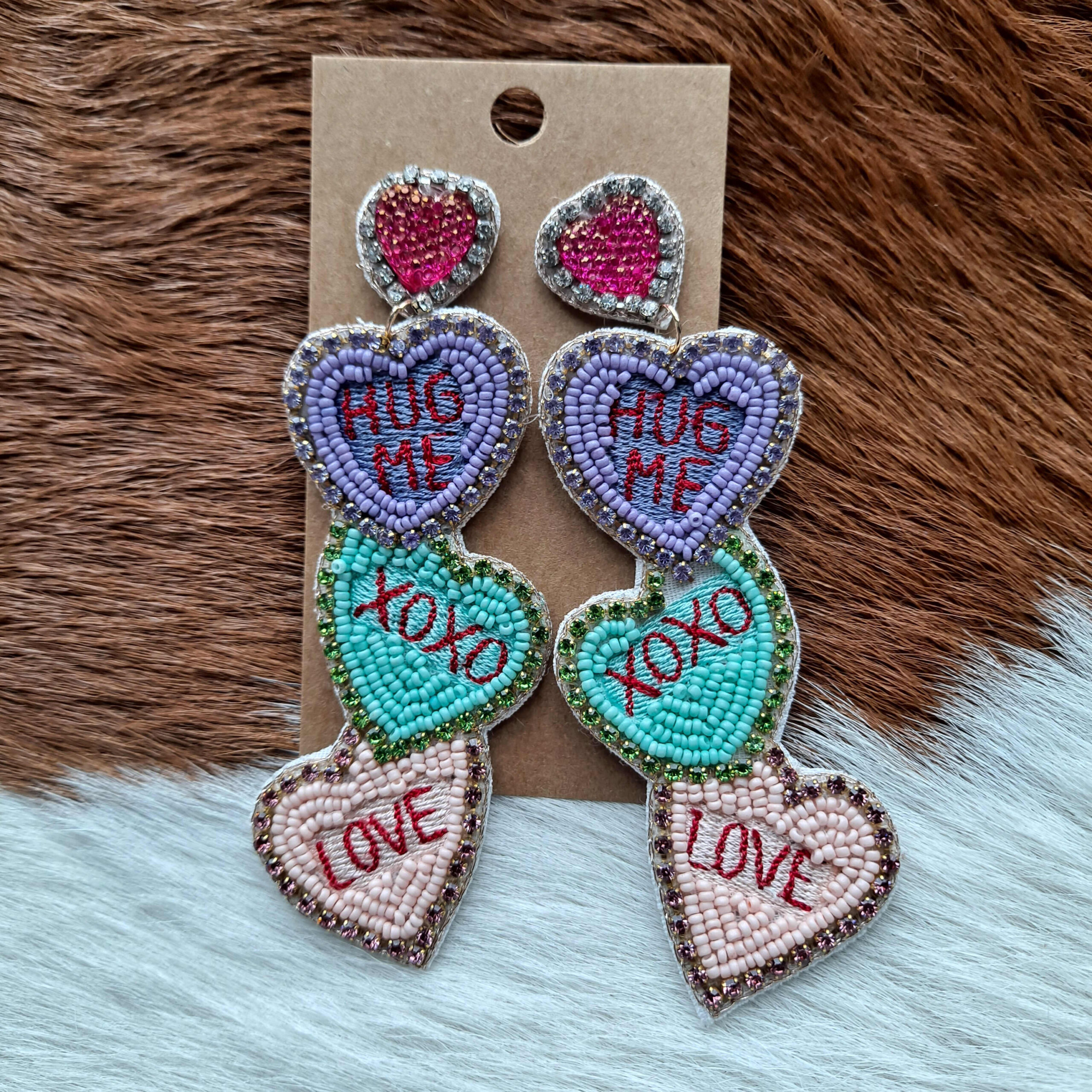 Valentine Candy Heart Seed Bead Fabric Post Dangling Earrings
